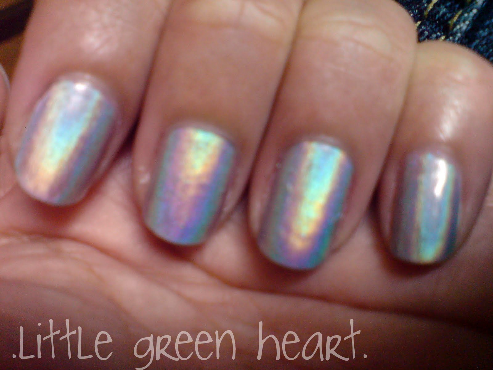So after much dwelling with the occasional headache, I decided to try out the China Glaze - OMG as my first mani from this swap. :) And OMG! It was just so so awesomely holo-ish! That said, this is my first holo nail polish and I get awed pretty easy~ hehe.. So here are pictures of me trying to take the wonderful holo effects with my not-so-great camera phone (sigh~ I seriously need to get a decent camera soon)