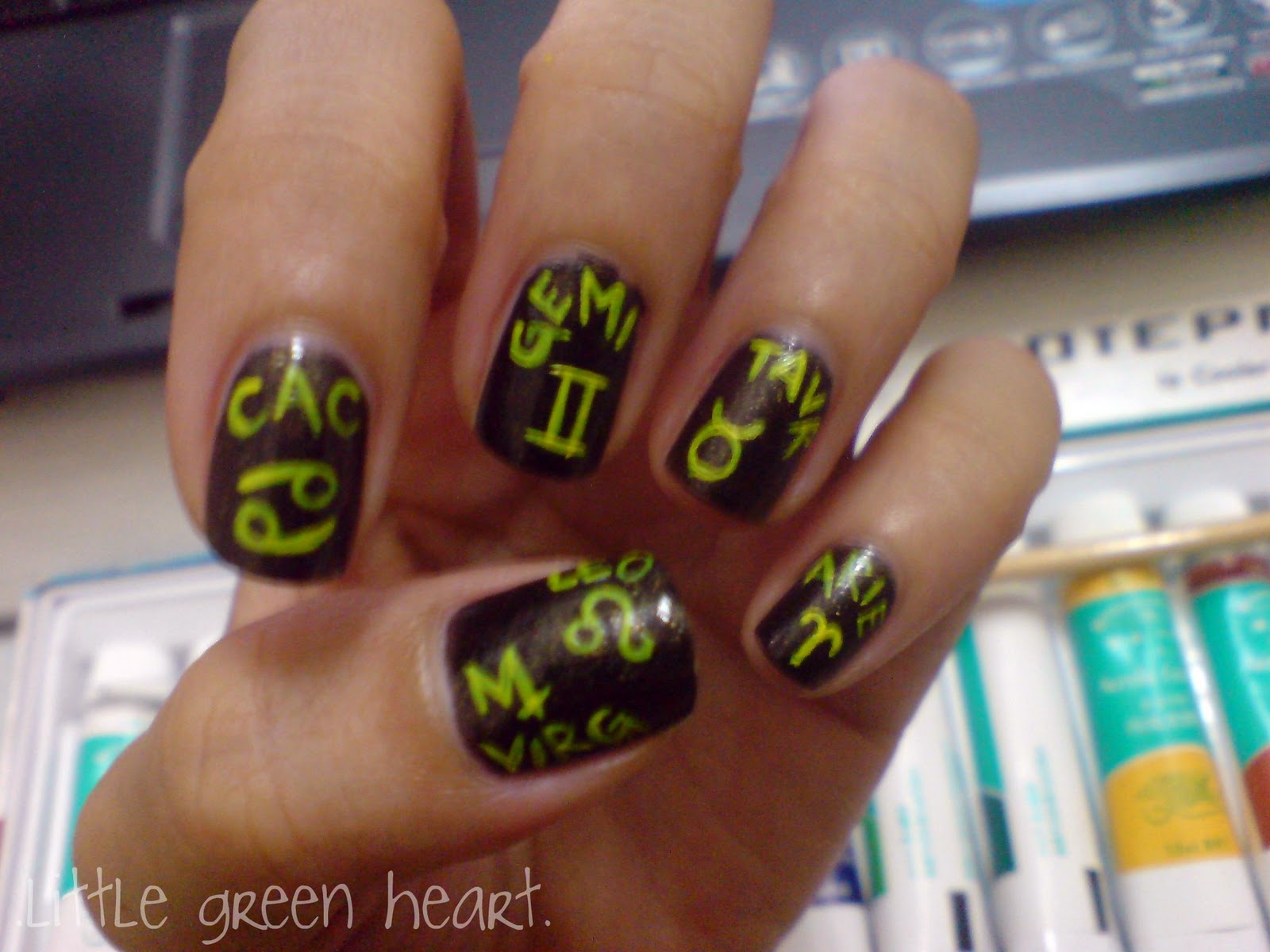 Im really sorry for the blurry pics~ Took them at night and by morning I had scratches and shrinkage. >.< bleh~ Anyways, for base I used Eleanor in Black with Glittery Gold and just painted the letters and symbol in Yellow Acrylic Paint. If I'm not mistaken, the zodiac names are in Swedish, found it on the net. :) Thanks for stopping by! Oh wait! Did you hear about the 13th zodiac? Ophiuchus? Argh~ Im an Aries an will always be an Aries. I just don't get how they can just add another zodiac. *rant over* :D