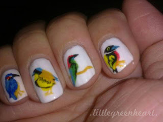 Hello there~ Here's a post that's not related to the 30day challenge. I've still got the blue nails on now. >.< I can't get over the awesomeness of the blue nails (i know i know, its just a plain mani but the blue of Etude House BL501 is just too pretty to be taken off) LOL! Now i'm just rambling. Anyways~ My aunt came over the other day to get her nails done. She wanted birds on her nails so this is what we came up with. :D