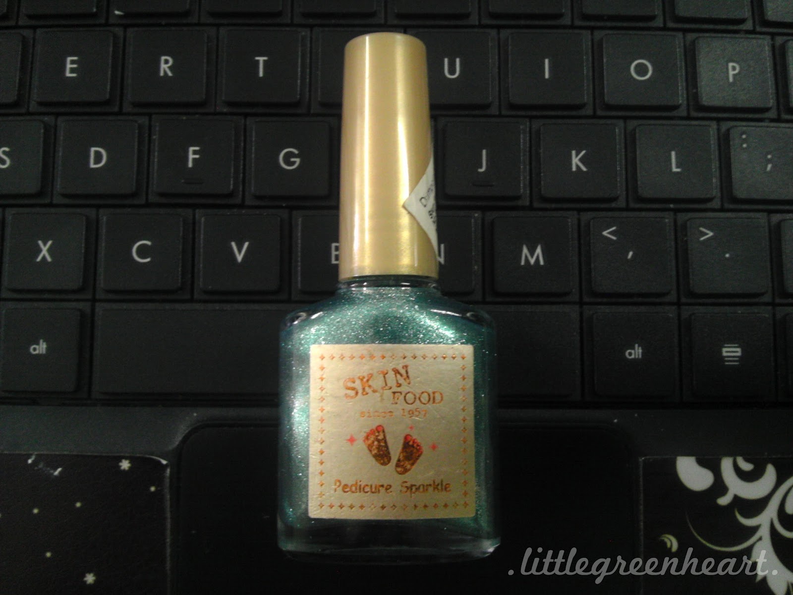 On to the NOTD.. I've been on a green polish streak lately. :) Today's post is on Skin Food Pedicure Sparkle in #20. It's a somewhat sea green foil color. I got this from a dear friend of mine when she decided to de-stash some of her polish. :) Application was smooth and dreamy. I didn't have any pooling or dragging issue with this polish, so YAY! Let's get on to the swatches shall we. :)