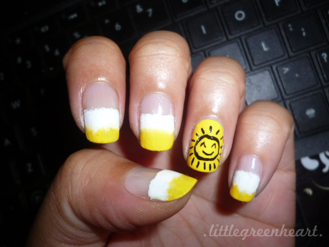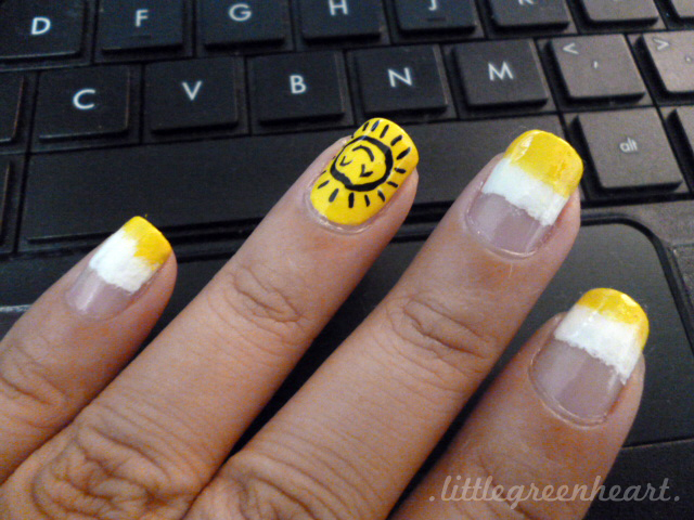 I used the sponging technique on all of my fingers except my ring finger. Polishes used were ChG- Happy Go Lucky and Color Combos- White. Then I drew on the sun with black acrylic paint and a really small brush. :) What do you think of this mani? I personally like the sun! ^_^ Thanks for dropping by! :D