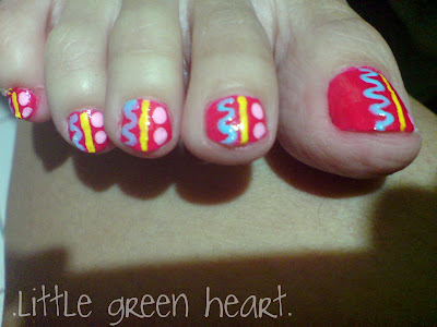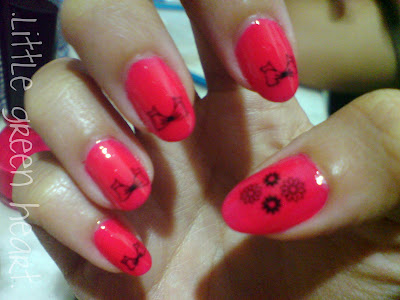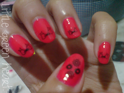 My aunt and cousins came over for a visit a few hours ago. :D And guess what! Yep.. I did my cousin's nails and my mum's toenails (long overdue..). I won't go on further cos I'm pretty sleepy right now but still want to blog about it. So I'll just show you guys the pictures. So sorry for the poor lighting. It's already night here and I won't have a chance of taking a better picture of my cousin's nails but I will take a picture of my mum's pedi tomorrow. :) Enjoy!