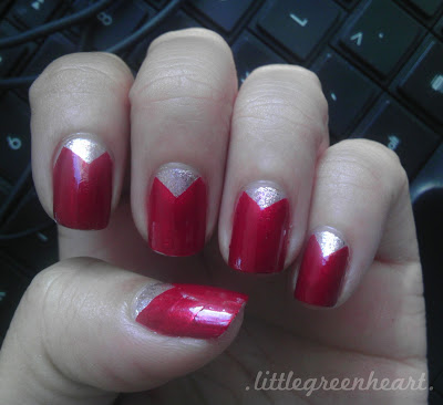 I hope I can keep this blogging streak going. :D It's been awhile since I've done a half moon mani, but instead of doing the traditional round shape I did a triangle one instead. I did this mani last night after work so it was rather rushed and sloppy. I didn't use any additional tool (tape) for the triangle, just the brush from the nail polish bottle alone (hence the uneven lines).